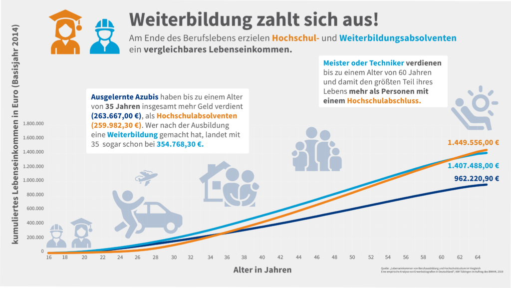 Aber stimmt das wirklich? Nicht unbedingt: Am Ende ihres Erwerbslebens haben Akademiker und Personen mit einer abgeschlossenen Höheren Berufsbildung – also beispielsweise Meister, Fachwirte und Techniker – fast gleich viel verdient, nämlich rund 1,4 Millionen Euro brutto, was eine aktuelle Studie des Instituts für Angewandte Wirtschaftsforschung an der Universität Tübingen (IAW) belegt, die im Auftrag des Baden-Württembergischen Industrie- und Handelskammertags (BWIHK) erstellt wurde.