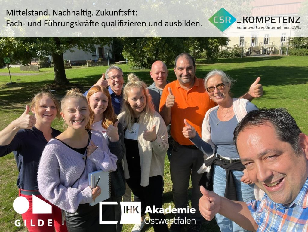 Im Rahmen der Aktion „Fachkräfte für OWL“ der Regionalagentur OWL vom 18. – 30. September 2023 laden wir Sie und Euch ein zu: „Mittelstand. Nachhaltig. Zukunftsfit: Fach- und Führungskräfte qualifizieren und ausbilden“ – eine kostenlose Online-Veranstaltung vom CSR-Kompetenzzentrum OWL / GILDE und der IHK-Akademie Ostwestfalen.